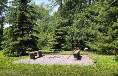 The deck over looks the praire and the bon fire pit. There are short trails for walking. The nearest house is 1/2 mile down the road. New Ulm and St Peter are short drives. This property is seasonal. The only source of heat is the wood burning stove on the main floor. There are two window AC units to keep comfortable if it is hot out.