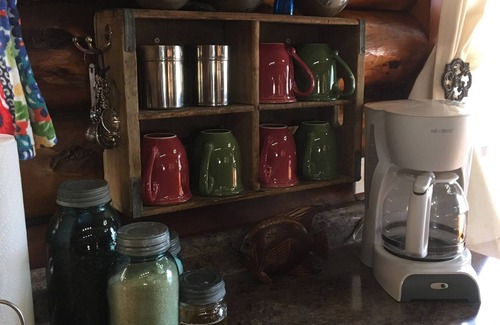 The welcoming living room has a cobblestone fireplace with a wood stove insert and the room is open to the cozy kitchen and dining area. A modern propane gas stove, microwave and refrigerator give you the conveniences of home. Coffee and microwave popcorn is waiting for you. The kitchen is equipped with plates, cups, utensils, cookware and a number of small appliances(coffee maker, toaster, crock pot, toaster oven, electric griddle, electric fry pan)