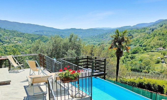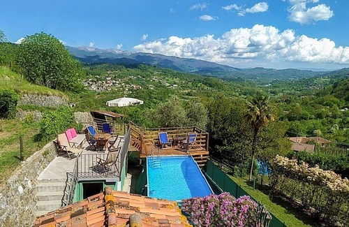 This village property has wonderful views from the terraces and pool which overlook the serchio valley, with the river and then the mountains in the distance.
