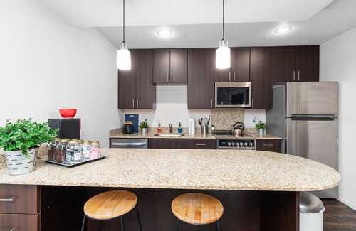 ✔Kitchen: Prepare delicious meals in the fully equipped kitchen featuring sleek countertops, stainless steel appliances, and essential cookware, making dining in a breeze. There is no dining table but the kitchen counter can accommodate up to 2 guests with 2 high chairs in it.