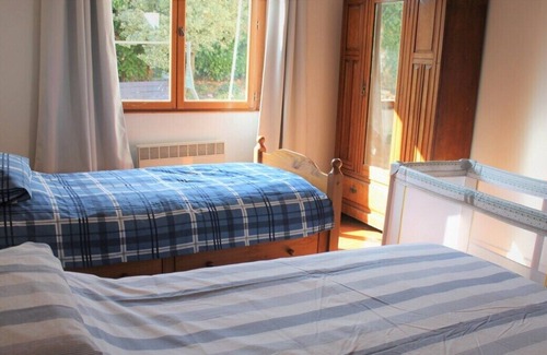 Maison Tom is a charming, self-contained, two-bedroom house, sleeping up to 5 guests. Downstairs there is a kitchen with a dining table and fridge freezer. Off the kitchen is a spacious bedroom with a king size bed and exposed beams. It has been stylishly furnished and benefits from a wood burner for cosy winter evenings. There are two chests of drawers, a freestanding mirror and a built-in wardrobe with hanging space. There is also a downstairs toilet. Upstairs is a lovely, large sitting area which is double height with more exposed beams and stone walls. There is a comfortable leather sofa and two armchairs to accommodate everyone. Up a step, along a corridor from the living area is a family bathroom with a bath, shower cubicle with double shower head, sink and toilet. There is also a second bedroom with three single beds, perfect for children or groups of friends.