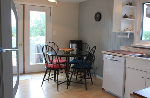 There is satellite TV, DVD player, fridge, stove, microwave, pots and pans, utensils and dinnerware. There is propane BBQ on the deck off the kitchen overlooking the river. Bedding and towels are provided.