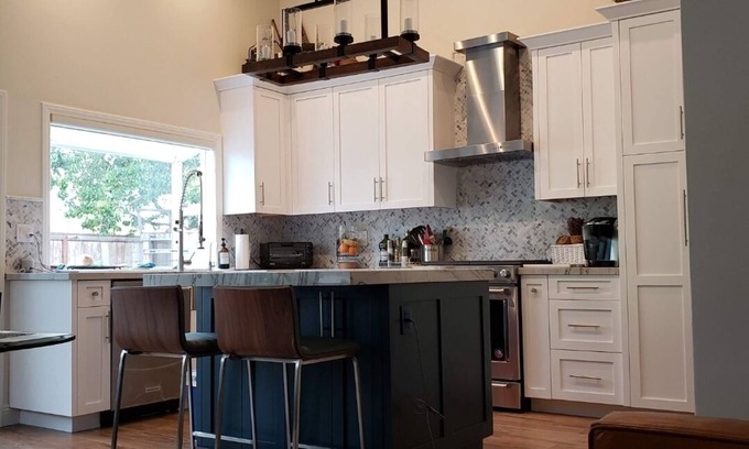 Enjoy sipping your coffee on the sofa overlooking your private backyard or at the table in the eat-in kitchen which has been completely renovated in a modern farm house decor with a vaulting high ceiling and working gas fireplace. The kitchen is a bright, sun filled room with sliding glass doors to the backyard where there is a dining table, seating for 6 and a Weber BBQ.