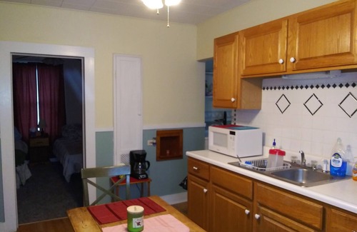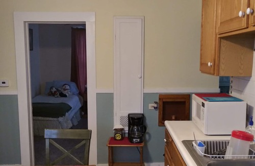 2 Bedroom apt located in a converted 1900 farmhouse. We welcome families, Businesses, Hunters, and Fisherpeople. This is a downstairs apt with ample parking for boats and trailers, a full kitchen with a microwave, coffee pot, and toaster. There is a large enclosed front porch to enjoy your morning coffee or evening card game. 2 bedrooms, the first one with 1 queen bed and one futon, perfect for children and smaller adults. The second bedroom has a Queen bed with floor space for an air mattress if you need additional sleeping space. Air mattress available upon request. Space is 4 rooms 2 bedrooms, Living room, and Lg kitchen, approx 650 sqft with pantry/laundry area, and full bath.