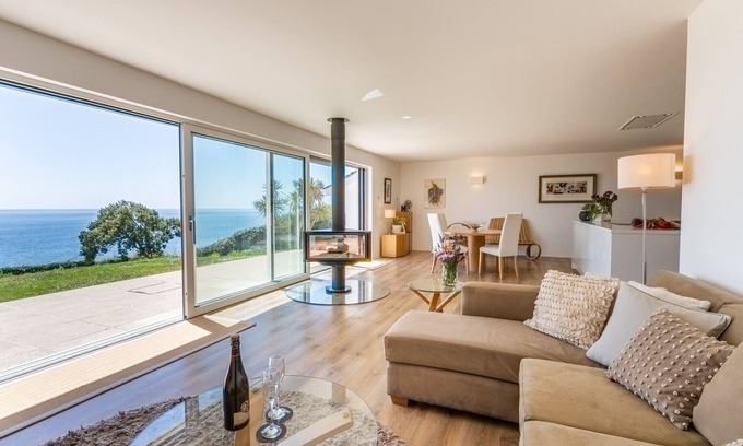 Panoramic sea views, chic designer interiors, and a glorious sense of relaxation await you at Avalon. This stunningly renovated house sits all on ground floor level and is located right above the coastline in the peaceful village of Downderry—ideal for a special getaway for a couple or small family.(Note: In this case, the translation is identical because the text is already in standard English with no significant British-to-American variations.)Offering expansive open plan living with contemporary styling, including a triptych wood stove in the center of the space, guests can enjoy their vacation retreat in luxury, with the sound of the waves just outside.There are three bedrooms:• The first is a spacious king-size bed (which can be converted into two small twin beds) with an attached bathroom, double doors out to a private patio, and sweeping ocean views.• The second bedroom has a queen bed with an attached bathroom, double doors to the main patio, and stunning ocean views.• The third bedroom has two bunk beds, sleeping up to four children.The bunk bedroom is best suited for younger children (under 10) or a maximum of two older children (up to 17). Please inquire for more details.The main family bathroom is generously sized and fully tiled, featuring a freestanding deep-soak tub for a touch of refined luxury. The kitchen facilities are excellent, with everything you'd expect, including two ovens and plenty of kitchen gadgets. As well as the interior dining table, which seats up to six, there is also plenty of space to dine al fresco, with a bistro table for two on the patio and a larger table seating six on the lawn below.Located between Torpoint and Looe, guests will be within walking distance of a cafe, restaurant, and pub, as well as the beach! With Downderry Beach and village less than a quarter of a mile to the east, and Seaton Beach and valley less than a mile to the west, there are plenty of beautiful coastal walks straight from the door.Within easy reach by car is the Rame Peninsula, or "Forgotten Cornwall"—a lovely area to explore and often much quieter than the rest of the county, even in high summer. The historic fishing town of Looe is just a short drive away, along with the stunning Fowey estuary, the picturesque cove of Polperro, and many other attractions.(Note: There are no significant differences between en_GB and en_US in this text, so the translation remains the same.)Access Details:• Designated parking• Internally all on one level• Large step down to the rear patio• Lawn accessed by stone stepsBooking Terms:- The home is suitable for max 5 adults, additional small children can be accommodated beyond this. Please contact us for more information. • Up to two small to medium, well-behaved dogs are accepted. Other pets by prior arrangement only.• A travel crib and/or high chair can be provided.• No smoking anywhere on site, indoors or outdoors.• No loud music after 10 pm out of courtesy to local residents.