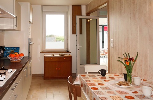 "Avel Dro", 3-room house 90 m2 on 2 levels. Renovated in 2019, comfortable and tasteful furnishings: living/dining room with Scandinavian wood stove, dining table and satellite TV (flat screen). Living room with winter garden with dining table. Exit to the terrace. Kitchen (oven, dishwasher, 4 gas rings, toaster, kettle, microwave, freezer, electric coffee machine, Capsules for coffee machine (Cafetière à dosettes) extra) with dining table. Shower, sep. WC. Top floor: (open staircase), 1 room with sloping ceilings with 1 french bed (160 cm, length 200 cm). 1 room with sloping ceilings with 2 beds (90 cm, length 200 cm). Sep. WC. Electric heating. Terrace. Terrace furniture, barbecue (portable), deck chairs (2). Facilities: washing machine, iron, children's high chair, baby cot, hair dryer. Internet (WiFi, free). Please note: non-smoking house. Maximum 1 pet/ dog allowed. Smoke alarm. Offer by a private individual according to Art. 155, IV of CGI.