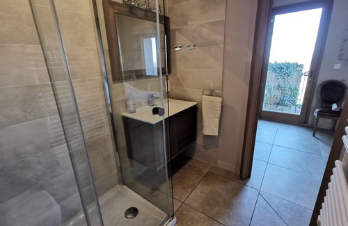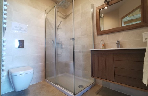 The bedroom is furnished with a new kingsize double bed and large cupboard and desk. The shower room has large 120cm shower, a WC and basin. The accommodation has been newly re-roofed with ecological insulation and full renovated. The pillows and duvets are made with organic cotton.