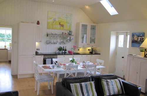 The Interior of this Gorgeous Cottage is simple, fresh and contemporary. There is a large, high-ceilinged, open-plan kitchen/living area with a stylish well equipped kitchen complete with a dining table for 8. In the living area, large comfortable leather sofas are perfect for stretching out on in front of the open fire.