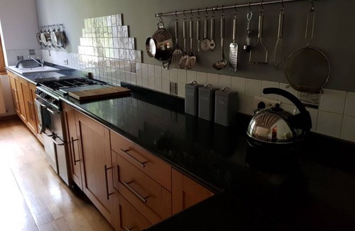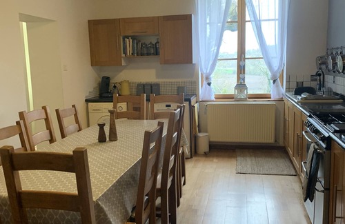 Large combined kitchen and dining room with a table for 10, american fridge freezer, washing machine,dish washer, microwave, toaster and Senseo coffee machine.There is also a large 5 ring cooker and two ovens.