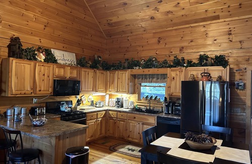 The two-story cabin is an outstanding combination of comfort and rustic charm. The main floor’s huge deck is ideal so you can savor the fresh mountain air, and listening to the birds singing in the sunshine. Sip your morning juice or coffee on one of the deck’s rockers; enjoy a meal at the outdoor dining table; stargaze late at night from the deck, it’s especially restorative after a day spent hiking, rafting, biking, or fishing. The cabin’s interior is just as relaxing and welcoming as its deck, with wood-planked floors, walls, and ceilings, comfortable furnishings, and plenty of windows to bring the outdoors in. There’s loads of seating in the living area for everyone to gather together to watch the big game on the flat-panel TV . In the winter the stone-surround gas fireplace is located in the living area, it will make the space even more charming than it already is. As well as being near attractions, Away from it all is close to markets—a good thing, because once you see the large, fabulously equipped kitchen, you’ll want to cook at least some of your meals here rather than dine out all the time. We have all the appliances, cookware, tableware, plenty of counter space, a dishwasher to make cleanup a snap: We also have a charcoal grill outside. The kitchen has it all. There are two bedrooms on the main floor. One bedroom is furnished with queen-size beds , the other bedroom has bunk beds, with a full size bed on the bottom and a twin on the top, this is a great space for your children. Each bedroom has its own flat-panel TV. These bedrooms share the cabin’s first floor full bathroom, It is a huge bathroom so you have plenty of room. The second story has the third bedroom, it is a queen bed with a private bathroom. Among the cabin’s other amenities are free WiFi, a charcoal grill, and a washer and dryer (for once you can return home from vacation with a suitcase full of clean clothes!) Do not forget to gather your friends and family around the fire pit at night. Unlike most cabins "Away from it all" has a huge yard so the kids have a huge place to play and your pets can enjoy the huge yard.