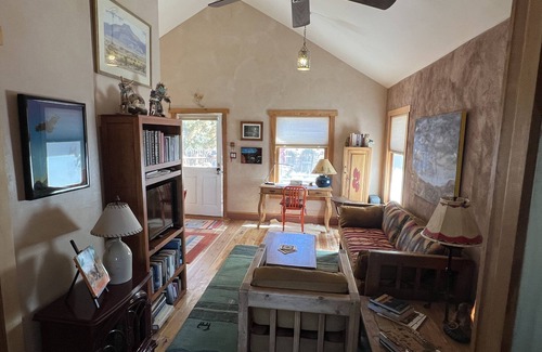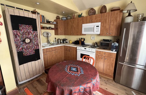The Casita is the north wing of the owners home (private, separate entrances and a double sound insulated wall between the casita and main house). It is a recently updated two bedroom space with a fully equipped kitchen. A large fireplace sits at the foot of the bed in the main bedroom, and stunning views of mountains and canyons can be seen from both bedrooms. There is a gated patio off the main bedroom with a large table and seating. There is also an outdoor fireplace for your use. A guitar and keyboard can be found in the main bedroom closet for guest use and bookcases full of eclectic works across all disciplines are ready to be taken up by a cozy fire or outside in the sun. The living room is complete with a smart TV, desk, and external monitor stashed away in the closet for use if needing to work during your stay ( there is strong wifi signal).
