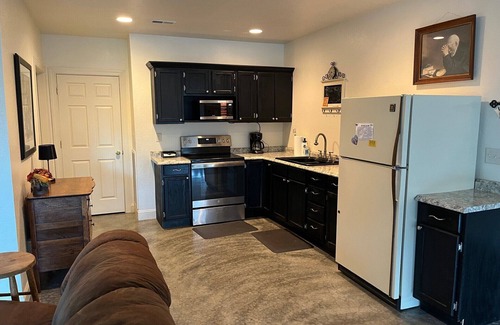 The Cabin at Nickajack is the perfect spot for your get-away and get-together! This 4- bedroom home, was built for family gatherings, and is accustomed to hospitality. It's our mountain oasis with gorgeous, breathtaking views of the lake from every room in the house. The most recent addition is the private Pickleball Court. Located 1/2 mile from Interstate 24, it's rural yet only 20 minutes from downtown Chattanooga. Built on the side of a mountain, the custom-built cabin features mountain views of Lake Nickajack and its two bridges. The wrap-around porch and outdoor seating will be one of your favorite areas. The cabin is perfectly arranged for privacy and gatherings. Each bedroom has its own bathroom. There are 3 queen beds, 1 kingsize bed, 1 daybed with a pop-up trundle (2 twin beds)in the loft, 1 daybed with a pop-up trundle (2 twin beds)in the lower living area, 3 sofas, a loveseat, a recliner, and rocking chairs, wireless internet, 6 TVs (4 smart and 2 equipped with DRVs), good cell phone reception, one fabulously equipped kitchen, and spacious parking. There's something for everyone, from Pickleball to peace and quiet to the hustle and bustle of the city. It's ideal for those who want to relax and curl up with a good book. You can watch the hummingbirds and bluebirds feeding over the garden and every evening, a gorgeous sunset awaits you. The lower level can be separated from the rest of the Cabin if more privacy is needed. This apartment includes the king size bed, trundle bed, full bath, separate living area and kitchen is located in the lower level.