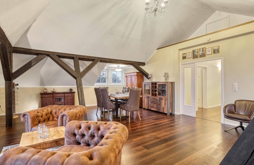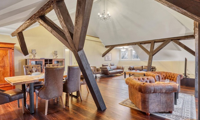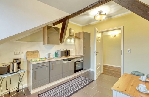 Escape from everyday life and spend relaxing days in this elegant holiday apartment. The quiet location and the lovingly designed interior provide the ideal basis for relaxing holiday moments as a couple, with family or friends. Experience a living ambience with character. The spacious living area under the roof impresses with its open beams, warm colours and stylish furniture. Enjoy film evenings together in the TV area or read a good book on one of the comfortable sofas or armchairs. Use the large dining table for meals together or a cosy breakfast. The modern kitchen allows you to prepare your own meals with ease. Start the day with a hot coffee and a delicious breakfast at the small dining table in the kitchen.