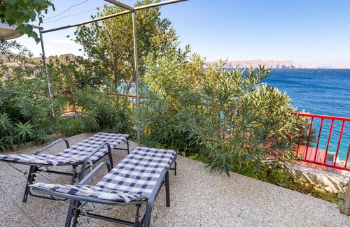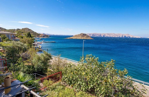 Enjoy the enchanting view of the sea and the proximity to the beach. The holiday apartment is located in the coastal village of Sveti Juraj, at the foot of the Velebit Mountains. Stairs lead down to the cosy accommodation. From the living room you can access a shady terrace surrounded by Mediterranean plants, ideal for relaxing. The main road passes below the house. There are shops and restaurants in the centre. Go on excursions to the Velebit and Plitvice Lakes National Parks. You can also visit the Nehaj fortress in the town of Senj and the islands of Rab and Pag.
