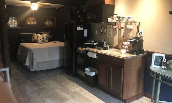 This Suite is cute, cute, cute... but still manly! It is set-up to inspire your sea legs and make you feel like the Captain of your own ship. This room surrounds you with authentic nautical decor, and a deep midnight blue bedroom with Plush queen size bed and its own flat screen TV which is great for day sleepers. You will feel like you are sleeping under the stars. The Living room area has a big comfy day bed/couch for relaxing and reading or watching the 2nd flat screen TV. The Kitchenette is stocked with pans, dishes, and utensils and includes a Keurig Coffee Maker. Your private bathroom has a large 2 person shower, plush towels and hand made soap.