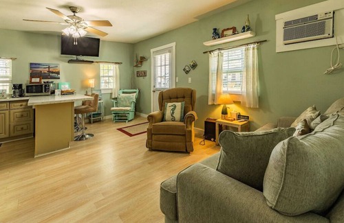 This Suite has a large separate bedroom with a plush queen size bed. There is a flat screen TV in the bedroom with a closet and armoire. The living area is perfect for relaxing and reading or watching the 2nd flat screen TV. The Kitchen in this unit is full size with a large fridge and is stocked with pans, dishes, and utensils and includes a Coffee Maker, coffees, and various sugars and creamers. Your private bathroom has a walk-in shower, plush towels and just enough room to spread out and relax.