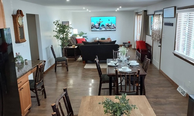You will love the openness as you enter the front door you walk into an open floor plan! The kitchen is to the left with stainless steel appliances and plenty of seating, with the dining room in the center. You will love to relax in the open living room with a 75" smart TV for streaming your favorite shows! You will enjoy relaxing in the living room with its super comfy sofa and love seat. In this home you will find two bedrooms with a king size beds and Large 55" smart TV's in both bedrooms. In the closet you will find a deluxe queen size electric blow up air bed that can be blown up in less than 3 minutes. We also provide extra sheets, pillows and blankets if you need them. The bathroom is spacious and complete with complimentary body wash, shampoo & conditioner. You will love taking a shower with the rain shower head. For the little ones in the family we supply a pack-in-play and a high chair.