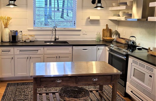 Completed in October 2018, this comfortable home has plenty of room for your family or three couples. Stunning architecture and tasteful furnishings make the house memorable in its own right. High ceilings and large windows in every room let you see forest and sky all around. The interior is sunny and uplifting, like the great outdoors. There’s a two-story living room with a towering slate fireplace, a full-size dining room, two private bedrooms, and two spacious bathrooms with walk-in glass showers. In the sunny, tree-top loft overlooking the living room, there’s a queen size bed and sleeper-sofa with a comfortable memory-foam mattress.