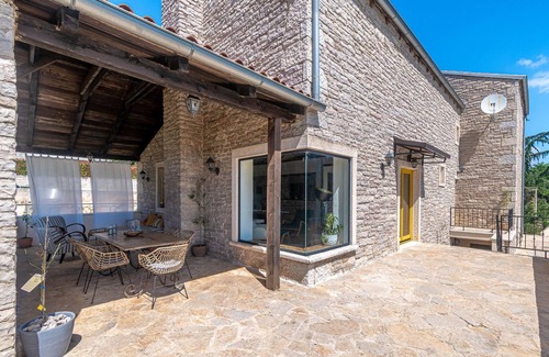 Your modern holiday home in Brajkovici near Pazin offers rustic elegance and maximum comfort. Settle down on the sunny terrace, equipped with cosy outdoor furniture, and enjoy the peaceful surroundings. The pool provides a refreshing dip, while the sauna offers relaxation for body and soul. Start your day with a relaxed breakfast on the large covered terrace and end the evening with a cosy barbecue. The spacious living area of the house invites you to relax. The rustic charm of the interior design creates the perfect feel-good atmosphere.