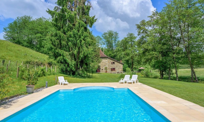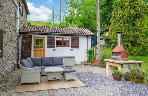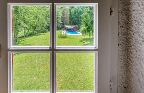 Your vacation home is located at the end of a gravel road and is very quiet. The only sounds you will hear come from the stream that flows through the property and the cows as they are taken from one pasture to the next by the farmers. The exposed stone walls, the mighty ceiling beams and the impressive open fireplace make the house very cozy. On the large plot you will find mainly lawn, it is surrounded by mature trees and houses a covered terrace and next to it a pool, which you can use from June to September. A toilet (WC and washbasin) on the upper floor. Accessible via bedrooms only.