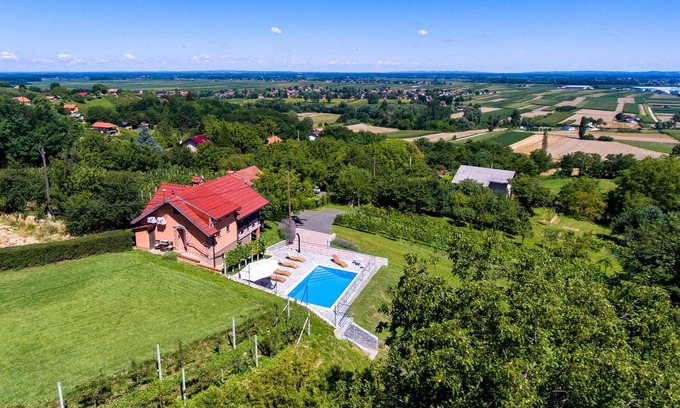 This beautiful holiday home is located on a small hill near the town of Ludbreg. Surrounded by vineyards, orchards and unspoilt nature, it offers you the perfect respite from city life. The attractive pool offers swimming fun for all, with views of the surrounding forest. On the ground floor there is a technical room and a tavern for tasting locally produced wines. On the upper floor there is a bathroom, a kitchen and a dining room with a living room and a covered terrace with a barbecue where you can enjoy delicious grilled dishes in the fresh air. The attic has two bedrooms with a minimum ceiling height of 100 cm. During your stay, be sure to visit Ludbreg, the baroque town of Varadin and the Varadin Spa, where you will find countless wellness offers and a water park for the little ones.