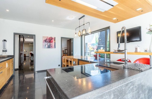 Your vacation home offers you the complete relaxation package. In addition to a fantastic garden, there is also a pool and a whirlpool at your disposal. The garden is a little paradise, just like the house itself. Here you have space, privacy and the nearest beach is just a short drive away. Enjoy the first-class comfort and unique style of your vacation home in the south of Marseille. Enjoy the wonderful view of the beautifully landscaped garden in the morning at breakfast. The stylish living room and the cozy seating on the terrace invite you to linger. Admire the modern works of art that adorn the walls.
