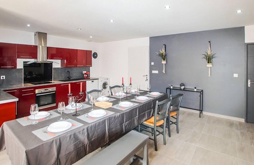 Not far from the papal city of Avignon and close to impressive natural paradises, this tastefully furnished holiday home in Provençal style invites you to come and relax. Here you can cook, dine and relax in a pleasant atmosphere. Look forward to convivial cooking in the open-plan kitchen, cheerful meals at the long dining table and cosy games evenings on the large sofa.