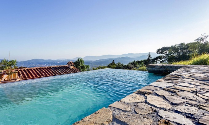 This vacation home near La Spezia promises relaxation and unforgettable moments. The luxurious and spacious vacation home is nestled in a picturesque hilly landscape and offers breathtaking views of the surrounding mountains and valleys. Start your day with a refreshing dip in the fabulous pool. The elegant interior of the house exudes a warm and inviting atmosphere. Make yourself comfortable in the spacious living room, which is furnished with high-quality furniture and stylish details. Prepare delicious meals in the open-plan kitchen-diner and serve them at the dining table or outside on the sunny terrace under the open sky.
