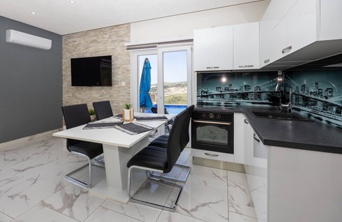 This vacation home awaits its guests in Labin-Plano, not far from Trogir and enchants with numerous extras. Floor-to-ceiling windows really bring out the view of the outdoors and provide beautiful daylight in the rooms. The modern furnishings and good equipment make the house the ideal place for a relaxing vacation.