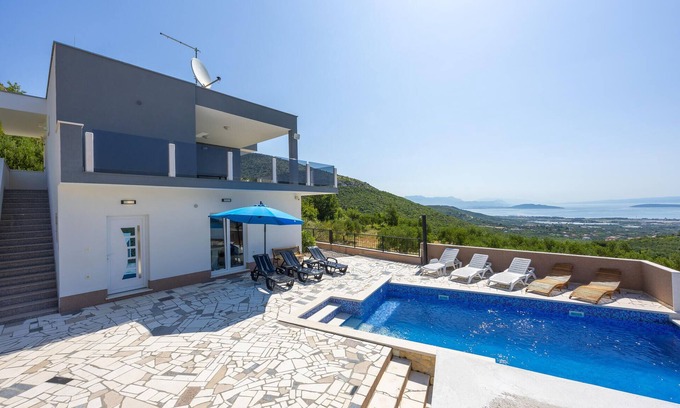 The terrace of the vacation home offers a beautiful panoramic view of the sea. In front of the house there is also a pool, which offers refreshment on hot days. The garden is fenced, so you can enjoy absolute privacy here.