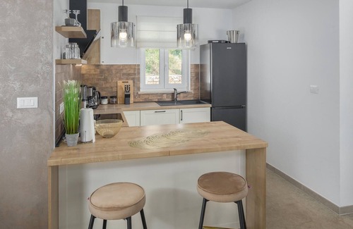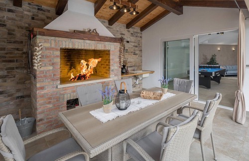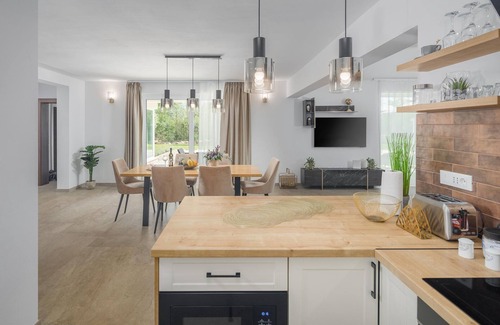 In this beautiful house, surrounded by greenery and nature you can immediately feel at home. Come with your family, friends and beloved four-legged friend to spend a pleasant time in Istria. The villa offers you plenty of space and countless entertainment options. Make yourself comfortable in the spacious rooms and alternate relaxation with activity. You can refresh yourself in the pool and then relax on the loungers, or challenge your loved ones to a match in table soccer. The couch is also a great place to relax, and the modern kitchen invites you to prepare your favorite dishes.