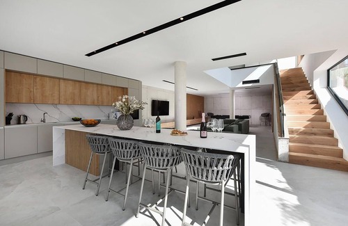 This holiday home welcomes you with an elegant, modern interior style that harmoniously combines minimalist aesthetics with luxurious details. Spend relaxing hours in the stylish living area or conjure up delicious dishes in the light-flooded designer kitchen while enjoying the sweeping sea views. Play a game of billiards or keep fit in the well-equipped fitness room.