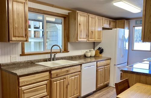 The main bedroom offers a king log bed, the second bedroom has a twin-over-queen log bunkbed that sleeps 3. For additional guests, the leather sofa in the living room has one of the comfiest queen-sized hide-a-beds you’ll ever sleep on. A portable crib and highchair are also available upon request. The bathroom has a shower only (no tub).