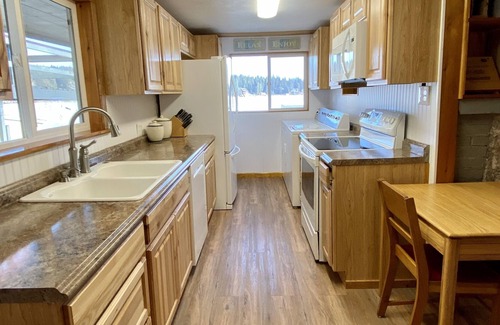 The home features a fully-equipped and newly remodeled kitchen, leather furniture in the spacious living room, two log-themed bedrooms, and a fireplace for those cool evenings. The home is around 800 sq. ft. and feels open with its large windows and slider door looking straight out at the gorgeous lake. Sit back and enjoy the view from the comfy reclining rockers inside, play a game at the small kitchen table, watch a movie on the flat screen, or gather at the dining table overlooking the water.