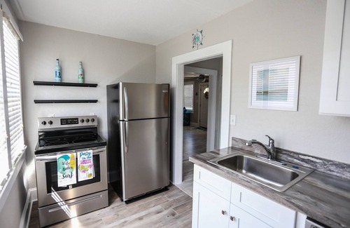 An adorable two bedroom, one bath house with a separate sititng room, and full size kitchen. The house is completely remodeled, with brand new cabinets, countertops, tile, and wood flooring. Tons of space, and a split floorplan for privacy. Brand new furnishings with total beach flair. Each bedroom has new queen size beds, dressers, mirrors, and vanity options. Remote accessible ceiling fans are located throughout the house. Three large flat screened smart TV's are situated in the living room, bedroom, and separate sitting room. Bathroom is wheelchair accessible, as is the house itself. Living room has a new couch, and sitting room has a futon for additional sleeping options.The home includes a washer and dryer(available for weekly or monthly reservations), beach chairs and umbrellas, a beach cooler, rafts, and a beach cart for easy transport.. All linens are included and the kitchen has all the necessities needed including a Keurig coffee maker, and blender. An ironing board and iron are also included. The entry door locks are key less and you will provide the four digit code to be programmed so you can easily remember it . The kitchen includes brand new stainless steel appliances: a refrigerator, range, microwave oven and a dishwasher. High speed internet access is included. Smart TV's are loaded with APP's for your viewing pleasure.
