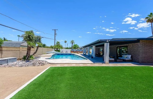 Located in Moon Valley, a beautiful and quiet North Phoenix neighborhood, Hacienda Arroyo was designed with the full intention to optimize your stay. This is a fully remodeled home with a modern appeal. There are four rooms; 3 bedrooms with king sized , high end mattresses and comfy pillows that also are equipped with a workspace. The fourth room has 2 - queen over queen bunk beds and is great for entertaining children as it has a TV, lego table, bean bags, books, toys and a two chair workspace. The main living areas is vast with high ceilings, plenty of space for 2-3 families. The large private backyard is equipped with a massive swimming pool (fenced), massive outside dining table, multiple shaded seating areas, loungers by the pool, a gas fire pit, artificial turf area and bags boards.