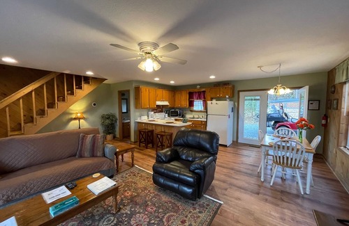Azalea is a two story cabin with a king bedroom and large bedside jetting jacuzzi tub on second level as well as a 1/2 bath on upper level. Main level of Azalea cabin has a full bath, a great room with a new sleeper sofa, a living room and dining area, as well as a full kitchen. It also has a Stone gas fireplace (seasonal use only), a Roku Streaming TV. An oversized, wrap-around porch with a swing and a grill.