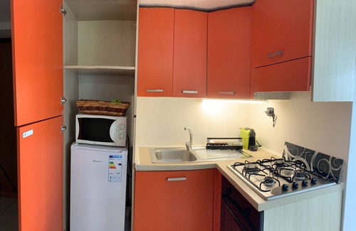 The living room that overlooks a small communal citrus grove, is equipped with a sofa bed possibly for a third person, a table, flat-screen TV, a small bookcase, an equipped kitchen, also with microwave and espresso machine. The balcony has a small laundry room equipped with a washing machine.