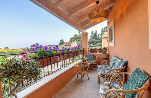 Welcome to Bótzos Residence, a serene blend of heritage and modern rustic luxury in the heart of historic Doukades village on Corfu Island, Greece. This restored rural retreat features two exclusive apartments - the Olive and the Terracotta Bedchambers. Crafted with care, each space offers natural stone, wood, and handcrafted details, blending tradition with contemporary comfort. Enjoy full amenities, concierge service, and the option to book the entire residence for an unforgettable stay.Olive Suite – Where Heritage Meets Refined Comfort:Perched gracefully on the top floor of the beautifully restored Bótzos Residence, the Olive Suite is a one-bedroom, one-bathroom hideaway designed to impress; perfect for both short escapes and longer stays. This tranquil, country-chic gem is nestled in the heart of the traditional village of Doukades and masterfully fuses timeless Corfiot architecture with the latest modern comforts.Inside, exposed stone walls, vaulted wooden ceilings, and soft ambient lighting create a calming, sophisticated ambiance. Skylight floods the space with natural light by day and offers a magical view of the starlit sky by night. The bespoke kitchen features a hand-painted finish, a farmhouse sink, and artisan stonework, while the bathroom boasts a sculptural natural stone basin and luxurious gold fixtures.Step onto your private flower-lined balcony to sip your morning coffee or enjoy a sunset aperitif while gazing across terracotta rooftops and olive groves. Every detail has been curated for beauty and comfort, from the curated artwork and custom furnishings to the intimate lighting and organic textures throughout.________________________________________Suite Highlights:•Top-floor position within a two-suite historic villa (ground floor hosts the Terracotta Suite).•Open-plan living/dining/kitchen area with views and natural light.•Handcrafted kitchen with oak inspired countertops and traditional farmhouse sink.•Spacious master bedroom with king-sized bed, skylight, and ensuite shower room.•Stone-clad private balcony with lounge seating and lush views.•Restored architectural features including vaulted timber ceilings and exposed stone walls.•Courtyard-style entry and access to the charming village surroundings.________________________________________Location & Lifestyle:•Set in the heart of Doukades, one of Corfu’s most picturesque and preserved villages.•Easy stroll to the village square and nearby tavernas.•Walking distance to the trail leading to Agios Symeon, a scenic hike through pine forest to a hilltop chapel.________________________________________Included Amenities:•Complimentary StarLink Wi-Fi connectivity.•Satellite TV & Free Netflix.•Air conditioning.•Bluetooth speaker.•Nespresso machine.•Fully equipped kitchen with dishwasher. •Washing machine & dryer.•Iron, ironing board, safe, and hairdryer.•Beach towels provided.•Free public parking nearby.________________________________________Services:•Complimentary mid-stay cleaning with fresh linens & towels (for stays 7+ nights)Available on Request (additional charge):•Private chef•Childcare/nanny services•Airport transfers•Car rental________________________________________Now is the perfect time to discover your own slice of Corfiot paradise. Book the Olive Suite today and make every moment in Doukades a timeless memory.
