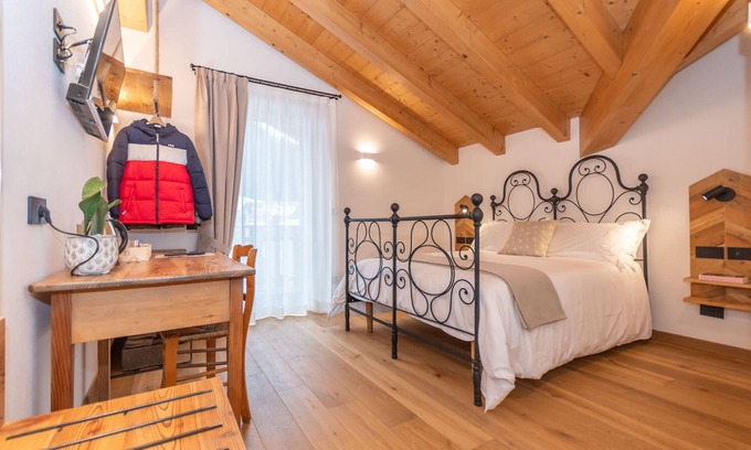 Welcome to the heart of the Dolomites at the El Lares B&B in Canale d'Agordo! In the heart of Canale d'Agordo, just minutes from the magnificent San Pellegrino Ski Area, you'll find the El Lares B&B, the perfect place to enjoy an unforgettable experience in the Dolomites. Features of this room:- Area: Approximately 20 square meters of pure comfort- Bed: Lovely wrought-iron French bed- Relaxation corner: Kettle and selection of herbal teas- Bathroom: Spacious bathroom with shower (no bidet)- Terrace: Spacious terrace with views of the Cime d'Auta peaks and the enveloping scent of the forestWhy choose El Lares? Contact with nature: Breathe in the fresh air and enjoy the spectacular view from your terrace. Modern design and tradition: A perfect mix. State-of-the-art technology: Free Wi-Fi and Smart TV for maximum comfort. Easy access: Enter with a QR Code, numeric code or classic key on the 2nd floor. Infrared sauna included Traditional atmosphere with a modern twist: Antique materials, reclaimed wood and furniture rich in history were used to offer you the authentic atmosphere of the Dolomites without sacrificing modernity. Skibus at 500 meters: in winter, reach the slopes without stress thanks to the skibus stop only 500 meters from the B&B. Forget about traffic and parking problems! Explore Canale d'Agordo: Besides being a gem in the Dolomites, Canale d'Agordo is the birthplace of Pope John Paul I. Visit his birthplace and MUSAL with an exclusive discount for our guests! Book your dream vacation now: call, email or book directly from this page. Your alpine retreat awaits you with open arms!