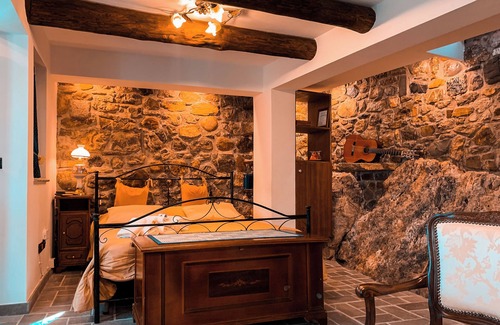 The "Pearl" suite is composed of two bright rooms on one level, with panoramic view over the valley, and can comfortably accommodate up to four people. The double bedroom, intimate and cozy, is embellished with a beautiful wall of rock, and also includes a private bathroom inside it. To complete the room, the large living area that includes a full and equipped kitchen, an elegant local stone fireplace fully functioning and a comfortable sitting room with sofa bed. A distinctive detail is the antique table in chestnut wood with flap, which also serves as a sideboard, and adds a touch of tradition to the environment.