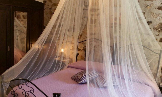 The "Amethyst" room is a true refuge of charm, embellished with an elegant canopy bed that gives an intimate and romantic atmosphere. A unique detail is represented by the remains of an ancient furnace, kept in a suggestive lateral niche. A further touch of authenticity is given by a sandblasted floor, together with an antique wood window, with scuretti and original hardware, which offers a lovely and relaxing view on the natural landscape, Conveniently located by the quiet river and the mountains in changing colors.