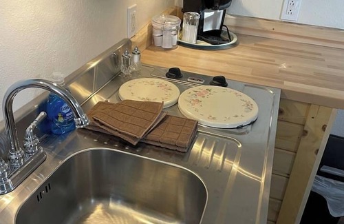 Baby Bear's Playhouse is an approximately 200 square foot tiny house ideal for one person or a couple, possibly traveling with a small child. It is a studio with a kitchenette, a combined seating and sleeping area, and a full bathroom. This tiny house has a small deck with a small table for outdoor dining. You can take the short trail to the enclosed picnic area where you will find a fire pit surrounded by comfortable seating ideal for toasting marshmallows and roasting hot dogs. There is a charcoal BBQ. The picnic area is a shared space with our other guests and is perfect place to make new friends.