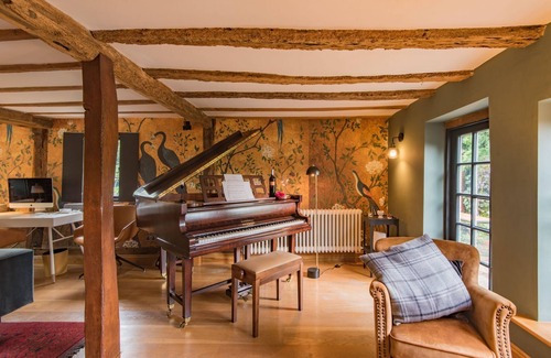 Drawing Room/Music room with seating for 8-10 guests, inglenook fireplace with log burner (logs and kindling supplied), desk area with Mac computer. A lovely piano and garden access to the side terrace.