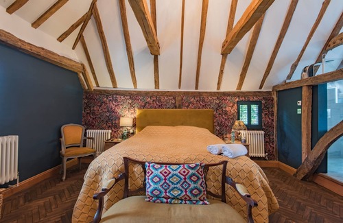 Master bedroom (sleeps 2) high beamed ceilings. Super king bed, open bathroom with copper bath, walk in shower, separate WC.. Built in wardrobes and a large screen Smart TV.