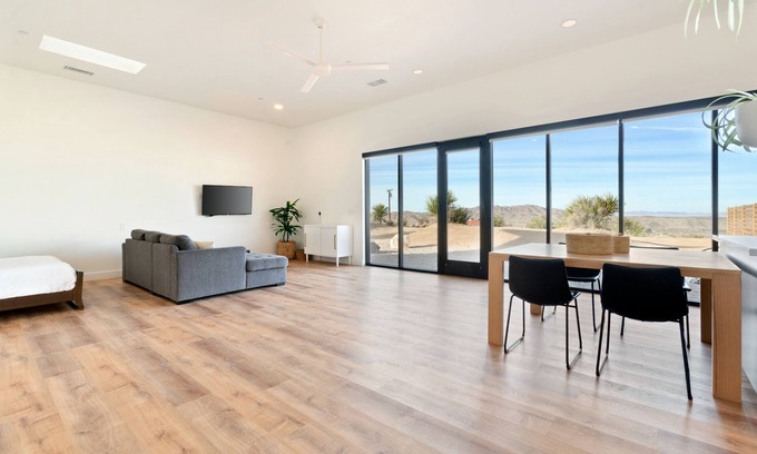 The Back Haus is a newly renovated studio home in Joshua Tree with incredible views of the entire desert from the front yard. Located within 5 miles of the Joshua Tree National Park entrance and a short 5 minute drive to town. We have created the perfect place for a peaceful desert retreat where you can relax, unwind and recharge.