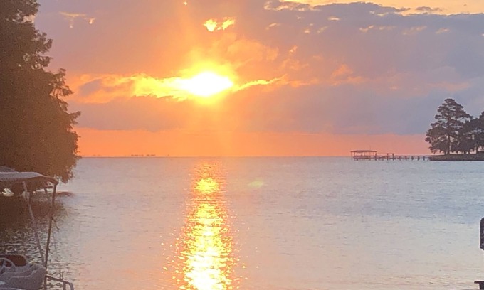 The house is equipped with a full kitchen, gas fire place, charcoal grill, dock, and outdoor seating. There is a large porch with fans for viewing the peaceful backyard, dock, and water. There is also an outside fire pit on the street side of the house. At night, the outside string lights, path lights, and flood lights illuminate the entire property. Towels and linens are provided.