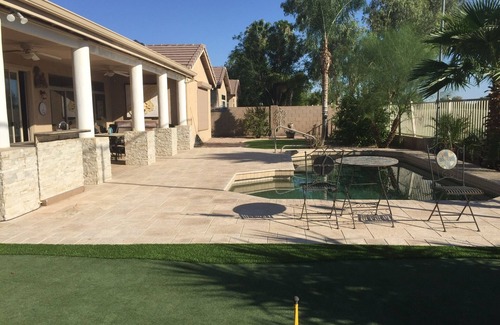 A OASIS Ranch style 4 bedroom home with POOL & GOLF course behind, practice Putting GREENS, 5 PINS in the yard. Real fake grass. FANTASTIC SUNSETS to enjoy with a beverage of choice. OUT DOOR KITCHEN with BBQ, FLAT GRILL, BURNERS, SINK, SIT UP BAR, MINI FRIDGE. SUPER 2200sf home with HIGH VAULTED CEILINGS, POOL TABLE in the living room, POKER TABLE or DINING TABLE. COUNTER HEIGHT KITCHEN TABLE with lazy susan in the middle. ISLAND, ICE & WATER FRIDGES IN KITHEN & BAR.
