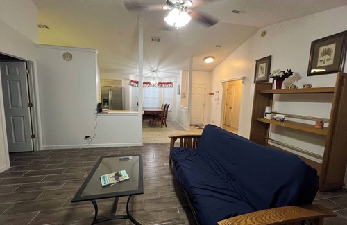 Escape to a superb 4-bedroom house in Kingsland. This tremendous property boasts 3 queen beds, 2 twin beds, and a cozy living room with a futon This centrally located place also boasts a backyard lake for fishing and is near I-95 and 40, close to Cumberland Island and Kings Bay Navy Base. A Tesla charging station is nearby, and it’s also close to a traveler train station. There are lot of restaurants in the area. The corner lot offers easy access for boats and trucks. The beaches are just 20 minutes away!