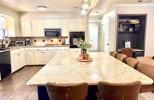 Outside, your private oasis awaits! The heated pool glistens under the Texas sky, inviting you in for a leisurely dip. Let your worries melt away in the hot tub, then wrap yourself in a plush towel and lounge on the patio, savoring the crisp evening air. Fire up the grill for an alfresco feast, or simply unwind under the twinkling stars with a glass of wine in hand.